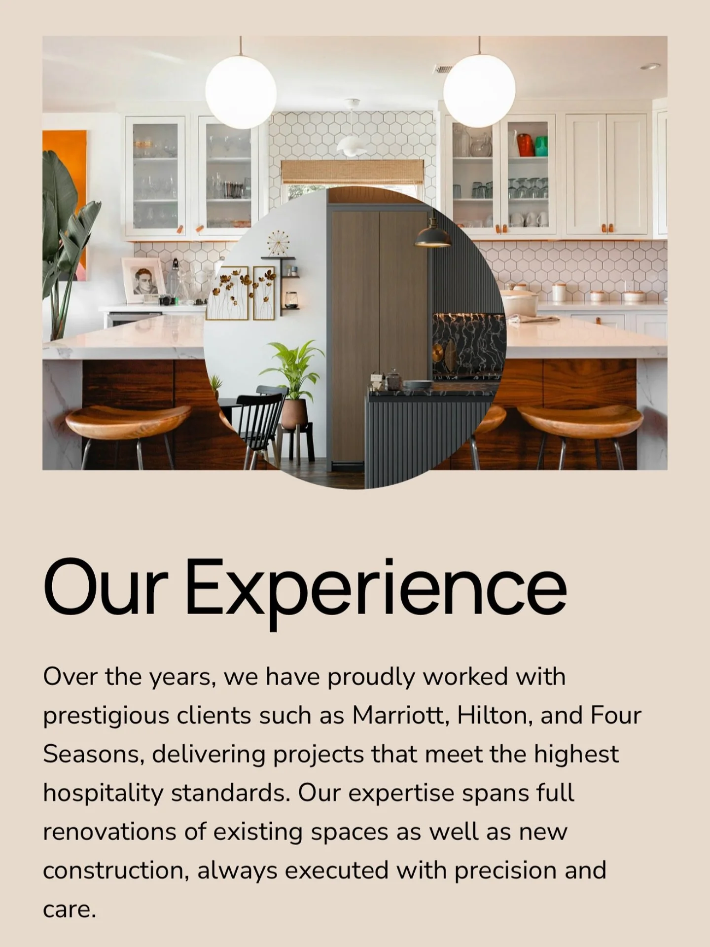 Over the years, we have proudly worked with prestigious clients such as Marriott, Hilton, and Four Seasons, delivering projects that meet the highest hospitality standards. Our expertise spans full renovations of existing spaces as well as new construction, always executed with precision and care.