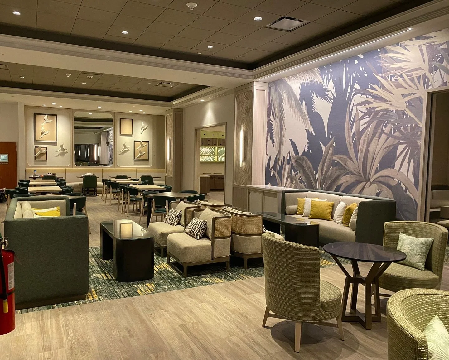 A modernized lobby with vibrant finishes, geometric accents, and a welcoming design that sets the tone from the moment visitors arrive.